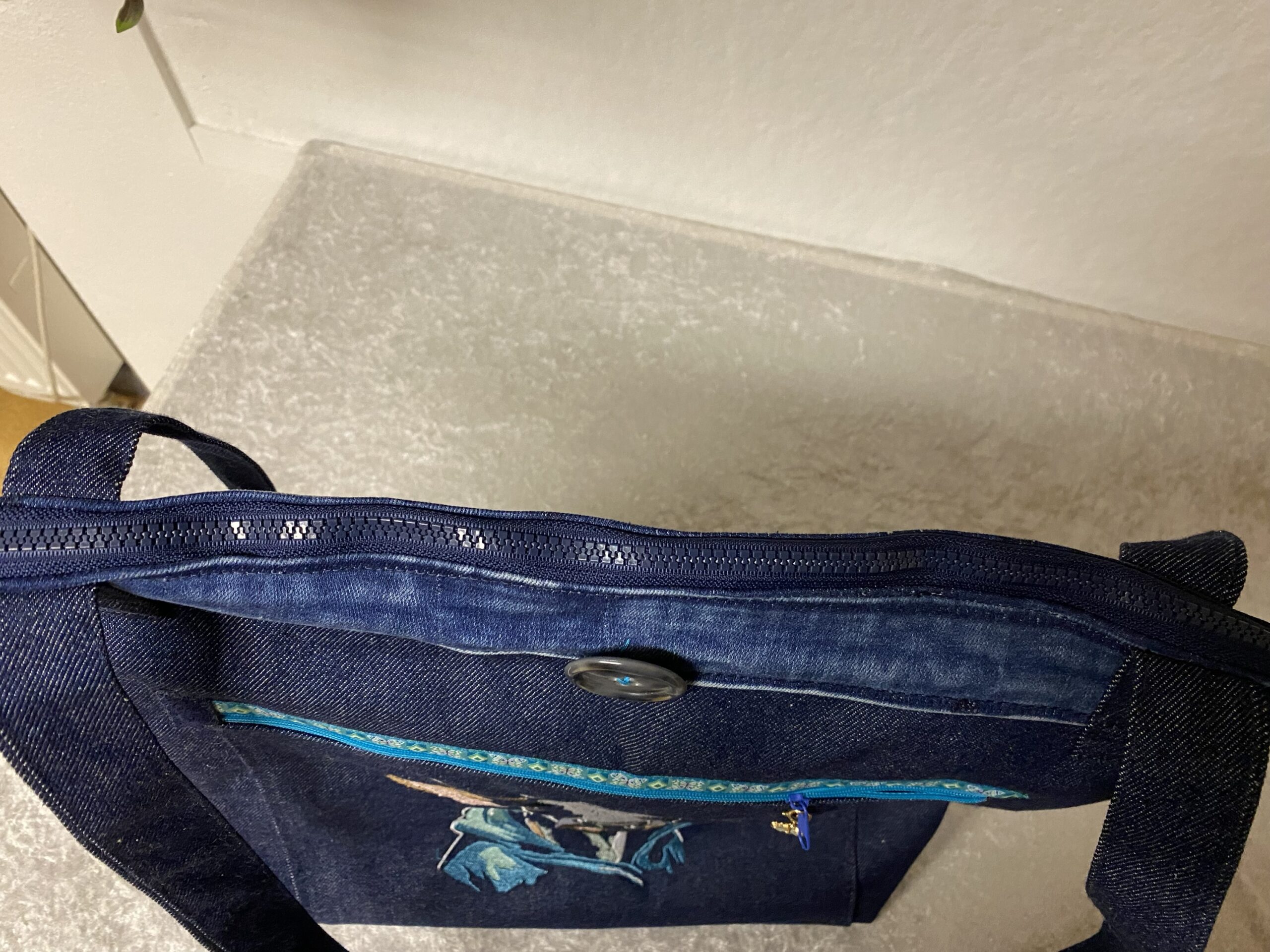 Die innen Tasche ist überwiegend mit Wachstuch gefüttert, somit wasserdicht und gut zu reinigen, wenn mal was ausgelaufen ist oder auch als Badetasche geeignet:)